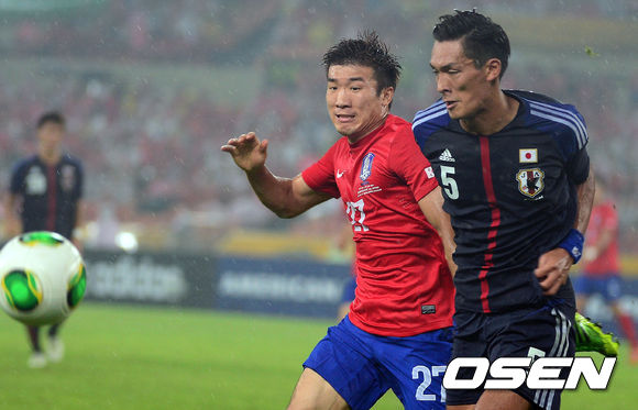 [OSNE=잠실, 곽영래 기자] 28일 오후 서울 잠실종합운동장에서 열린 2013 동아시안컵 축구선수권대회 한국과 일본의 경기 전반 한국 고요한이 볼 다툼을 벌이고 있다.