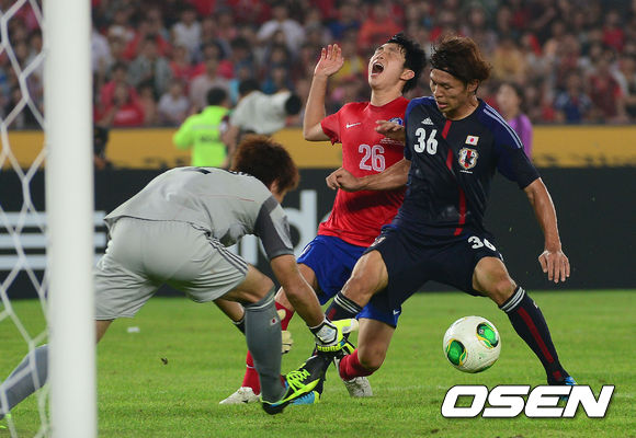 [OSNE=잠실, 곽영래 기자] 28일 오후 서울 잠실종합운동장에서 열린 2013 동아시안컵 축구선수권대회 한국과 일본의 경기 후반 한국 이승기가 찬스를 놓친 뒤 아쉬워하고 있다.
