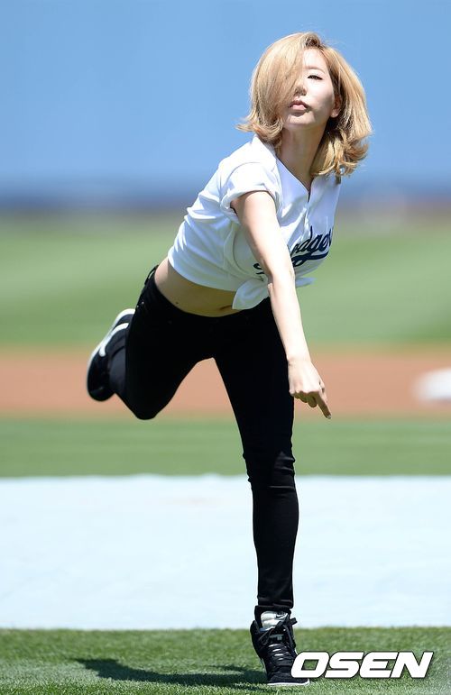 29일(이하 한국시간) 미국 캘리포니아주 로스앤젤레스 다저스타디움에서 열린 2013 메이저리그 LA 다저스와 신시내티 레즈의 경기, 경기에 앞서 소녀시대 써니가 시구를 하고 있다.