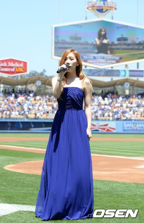 29일(이하 한국시간) 미국 캘리포니아주 로스앤젤레스 다저스타디움에서 열린 2013 메이저리그 LA 다저스와 신시내티 레즈의 경기, 경기에 앞서 소녀시대 태연이 애국가를 부르고 있다.