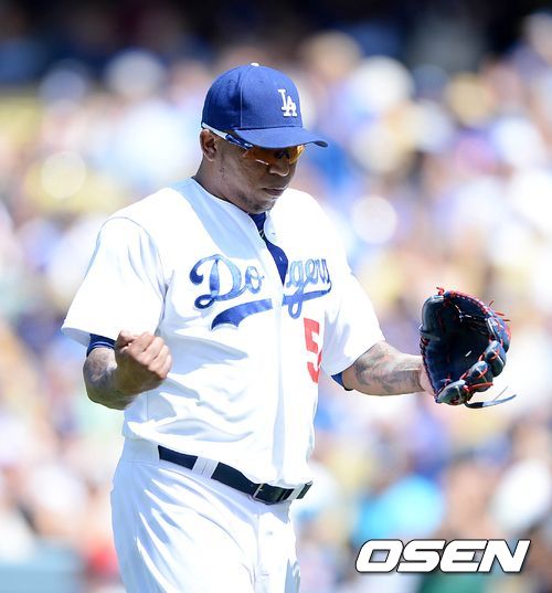 29일(이하 한국시간) 미국 캘리포니아주 로스앤젤레스 다저스타디움에서 열린 2013 메이저리그 LA 다저스와 신시내티 레즈의 경기, 7회초 2사 1,2루에서 LA 벨리사리오가 신시내티 코자트를 삼진으로 처리하고 환호하고 있다.