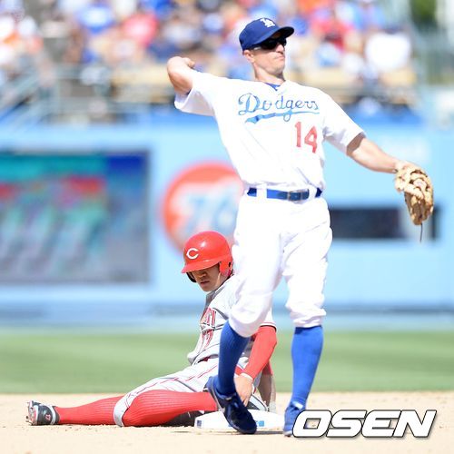 29일(이하 한국시간) 미국 캘리포니아주 로스앤젤레스 다저스타디움에서 열린 2013 메이저리그 LA 다저스와 신시내티 레즈의 경기, 8회초 1사 1루에서 신시내티 1루주자 추신수가 도루에 성공하고 있다.