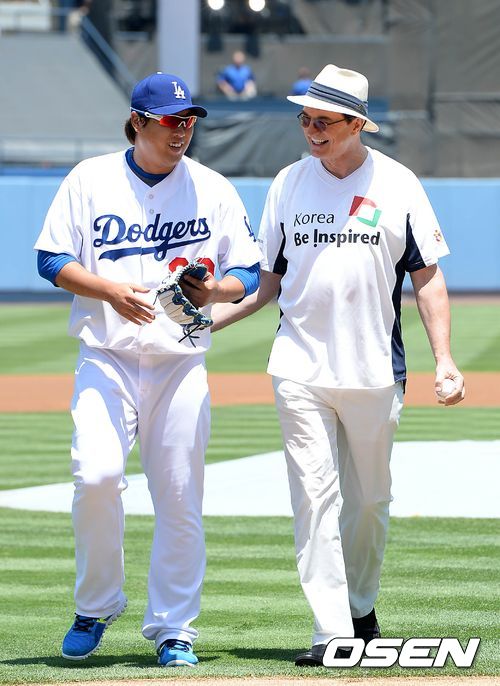 29일(이하 한국시간) 미국 캘리포니아주 로스앤젤레스 다저스타디움에서 열린 2013 메이저리그 LA 다저스와 신시내티 레즈의 경기, 경기에 앞서 시구를 마친 이참 한국관광공사 사장이 류현진과 이야기를 나누고 있다.