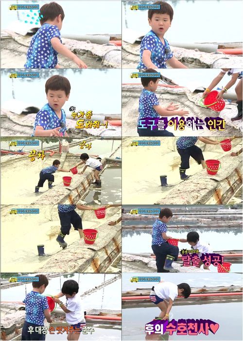 그는 발이 빠져 어쩔 줄 몰라하는 윤후를 보고 양동이를 이용해 윤후를 힘껏 끌어당겼다. 결국 ‘수호천사’ 준수의 힘을 빌어 윤후가 염전에서 빠져나올 수 있었다.