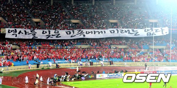 한편 이날 붉은악마는 이순신 장군과 안중근 의사의 플래카드를 퍼포먼스로 선보였다. 그리고 단재 신채호 선생의 '역사를 잊은 민족에게 미래는 없다'라는 글귀를 내걸었지만 일본 축구협회의 항의로 인해 빼앗기고 말았다.