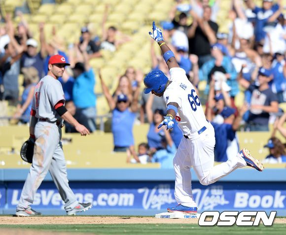 11회말 2사에서 LA 푸이그가 끝내기 홈런을 치고 환호하며 그라운드를 돌고 있다. /sunday@osen.co.kr