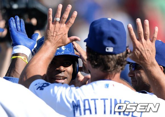 11회말 2사에서 LA 푸이그가 끝내기 홈런을 치고 매팅리 감독과 하이파이브를 하고 있다. /sunday@osen.co.kr