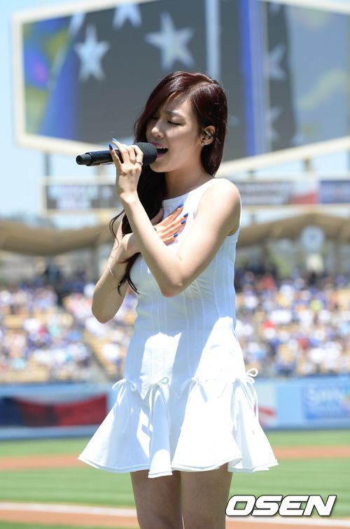 29일(이하 한국시간) 미국 캘리포니아주 로스앤젤레스 다저스타디움에서 열린 2013 메이저리그 LA 다저스와 신시내티 레즈의 경기, 경기에 앞서 소녀시대 티파니가 미국의 국가를 부르고 있다.