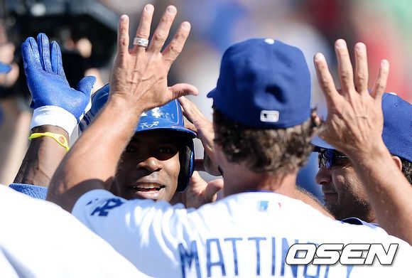 11회말 2사에서 LA 푸이그가 끝내기 홈런을 치고 매팅리 감독의 축하를 받고 있다. /sunday@osen.co.kr
