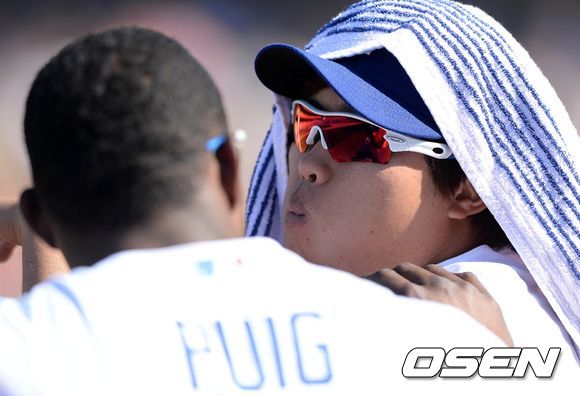 LA 푸이그와 류현진이 덕아웃에서 이야기를 나누고 있다. /sunday@osen.co.kr