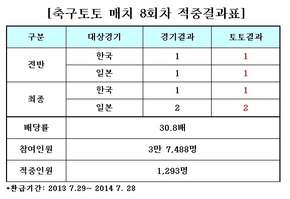 국민체육진흥공단(www.kspo.or.kr)이 발행하는 체육진흥투표권 수탁사업자인 스포츠토토㈜(www.sportstoto.co.kr)는 지난 28일 오후 8시 잠실종합경기장에서 벌어진 한국과 일본의 2013 동아시안컵을 대상으로 한 축구토토 매치 8회차 게임에서 모두 1,293명의 축구팬이 경기 결과를 정확히 맞혀 각각 베팅금액의 30.8배에 달하는 적중상금을 받게 됐다고 밝혔다.