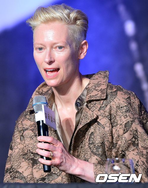 할리우드 배우 틸다 스윈튼이 29일 오전 서울 여의도 콘래드호텔에서 열린 영화 '설국열차'(감독 봉준호) 공식기자회견에 참석해 인사말을 하고 있다.