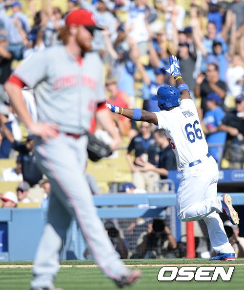 11회말 2사에서 LA 푸이그가 끝내기 홈런을 치고 환호하고 있다. /sunday@osen.co.kr