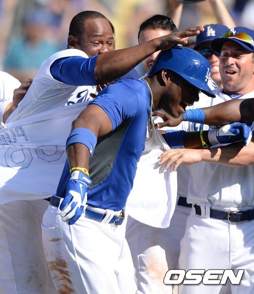 11회말 2사에서 LA 푸이그가 끝내기 홈런을 치고 동료들의 환영을 받고 있다. /sunday@osen.co.kr