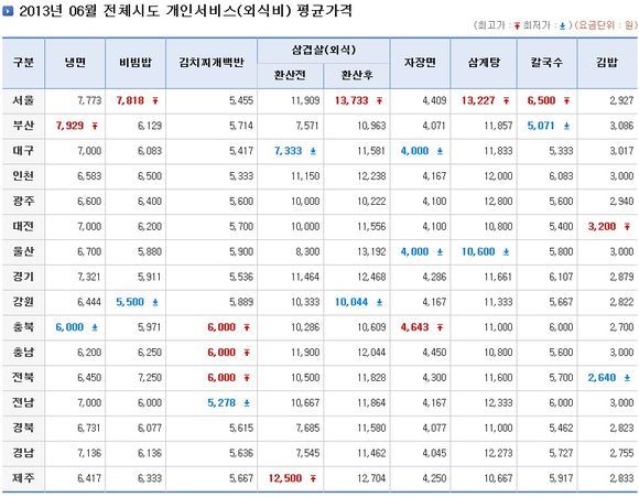 6월 기준 전국 외식비 비교를 보면 냉면은 1인기준 부산이 7,929원으로 가장 비싸고, 충북이 6,000원으로 가장 싸다.