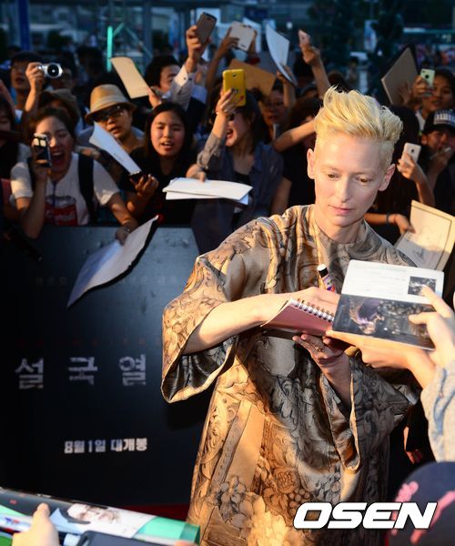 할리우드 배우 틸다 스윈튼이 29일 오후 서울 영등포 타임스퀘어에서 진행된 영화 '설국열차'(감독 봉준호) 월드프리미어 & 레드카펫 행사에 참석해 팬들과의 만남을 갖고 있다.