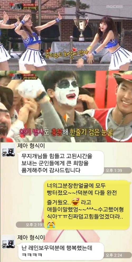 앞서 레인보우는 지난 28일 방송된 MBC ‘일밤-진짜 사나이’ 군인들의 체육대회 장기자랑 끝날 무렵 나타나 무대를 선보였다. 이날 레인보우가 ‘선샤인’과 ‘내 남자친구에게’ 노래를 부르자 박형식이 레인보우의 노래를 함께 부르고 군인들과 손을 잡고 폴짝폴짝 뛰는 등 폭발적으로 호응을 해 웃음을 자아냈다.