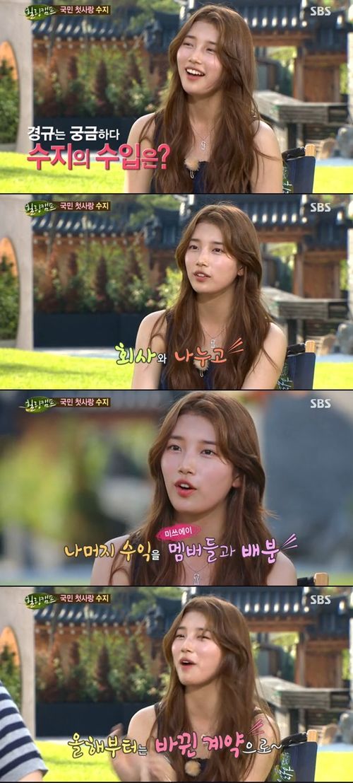 이에 MC 이경규가 수입을 물어보자 수지는 “수익이 생기면 회사랑 나누고 그 나머지를 미쓰에이 멤버들이랑 나눈다”고 말해 MC들이 놀라했다.