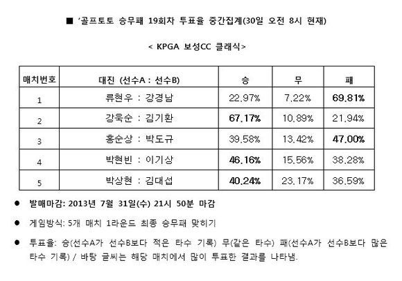 KPGA 보성CC 클래식 1라운드 대상 골프 승무패 19회차 중간집계 결과