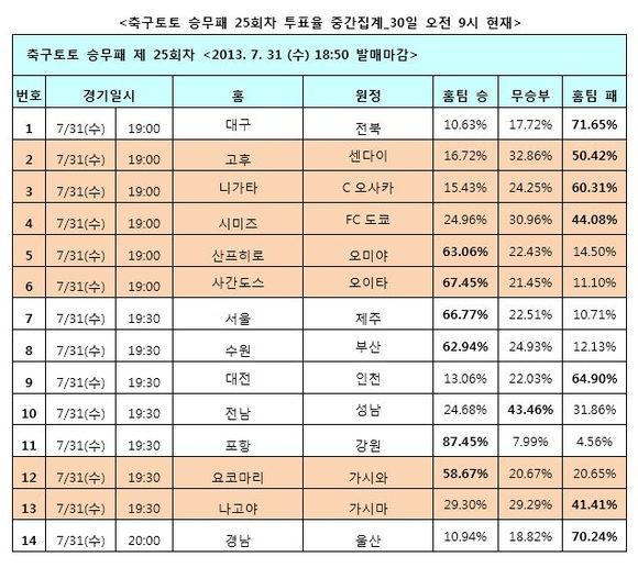 축구토토 승무패 25회차 투표율 중간집계 결과