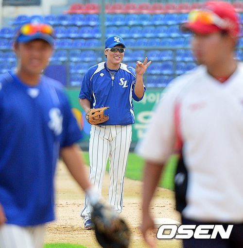 30일 오후 광주 무등경기장에서 열리는 '2013 한국야쿠르트 세븐 프로야구' KIA 타이거즈 대 삼성 라이온즈의 경기를 앞두고 삼성 이승엽이 KIA 선수들에게 제스처를 보내며 인사를 나누고 있다.
