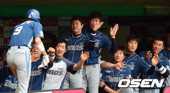 30일 오후 인천 문학구장에서 열린 '2013 한국야쿠르트 세븐 프로야구' SK 와이번스와 NC 다이노스의 경기, 1회초 무사 1루 NC 김종호가 모창민의 안타로 득점을 올린 뒤 동료들과 기뻐하고 있다.