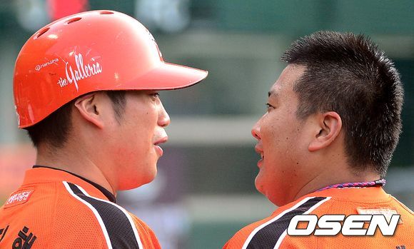 1회초 1사 2,3루에서 한화 최진행과 김태균이 김태완의 2타점 적시타에 홈을 밟고 더그아웃에서 이야기를 나누고 있다.