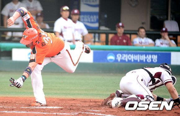1회초 1사 1,2루에서 한화 김태완이 정현석의 우전 적시타에 홈에서 넥센 박동원의 태그를 피해 세이프되고 있다.