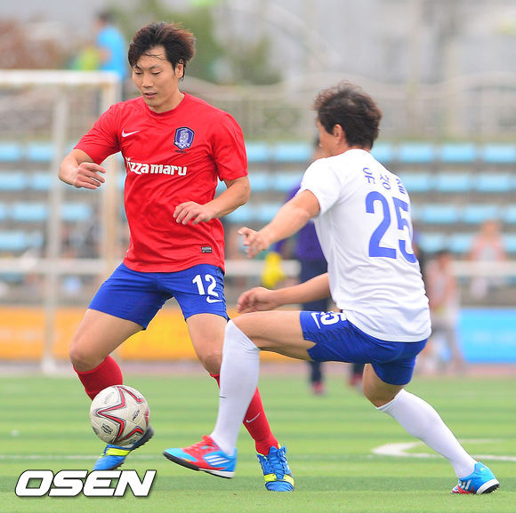 30일 오후 경기도 남양주종합운동장에서 열린 'I-리그' 여름축구축제' 국가대표 올스타팀과 연예인축구단의 친선 경기 후반 유상철과 송종국이 몸싸움을 펼치고 있다