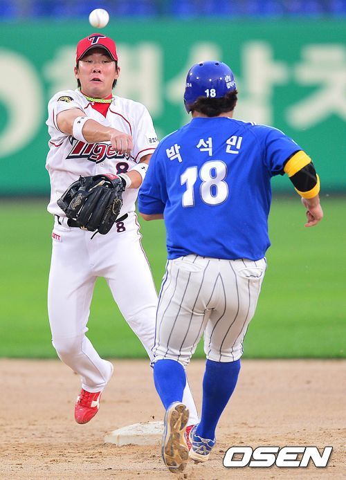 30일 오후 광주 무등경기장에서 '2013 한국야쿠르트 세븐 프로야구' KIA 타이거즈 대 삼성 라이온즈의 경기가 열렸다. 2회초 삼성 공격 무사 1, 2루 상황 7번타자 강명구의 내야 땅볼 때 KIA 2루수 안치홍이 주자 박석민을 포스아웃 시킨 뒤 1루를 향해 송구하고 있다.