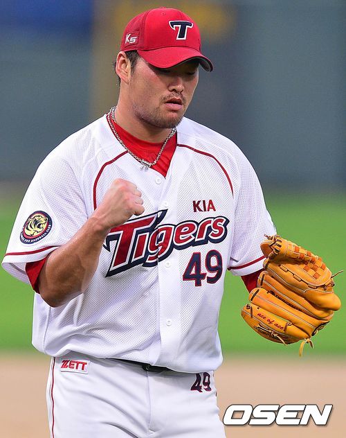 30일 오후 광주 무등경기장에서 '2013 한국야쿠르트 세븐 프로야구' KIA 타이거즈 대 삼성 라이온즈의 경기가 열렸다. 2회초 삼성 공격 2사 3루 상황 8번타자 진갑용을 삼진으로 이끌며 무실점으로 이닝을 마무리지은 KIA 선발 김진우가 주먹을 불끈 쥐며 더그아웃으로 들어오고 있다.