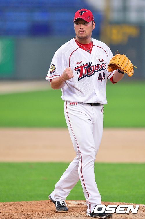 30일 오후 광주 무등경기장에서 '2013 한국야쿠르트 세븐 프로야구' KIA 타이거즈 대 삼성 라이온즈의 경기가 열렸다. 2회초 삼성 공격 무사 1, 2루 상황 7번타자 강명구를 병살로 잡아낸 KIA 선발 김진우가 주먹을 불끈 쥐고 있다.