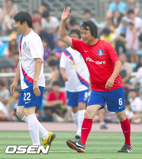30일 오후 경기도 남양주종합운동장에서 열린 'I-리그' 여름축구축제' 국가대표 올스타팀과 연예인축구단의 친선 경기 전반 조광래 전 감독이 신태용 전 감독과 장난 치고 있다.