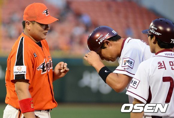 2회말 2사에서 사구로 출루한 넥센 안태영이 한화 김태균에 인사를 있다.