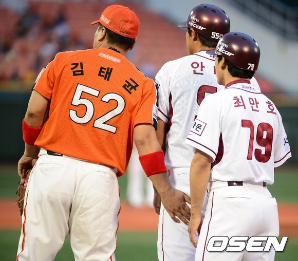 2회말 2사에서 사구로 출루한 넥센 안태영이 한화 김태균의 격려를 받고 있다.