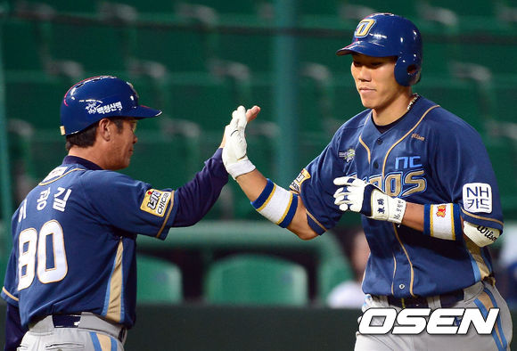30일 오후 인천 문학구장에서 열린 '2013 한국야쿠르트 세븐 프로야구' SK 와이번스와 NC 다이노스의 경기, 5회초 2사 NC 모창민이 솔로 홈런을 때린 뒤 3루 이광길 코치와 기뻐하고 있다.