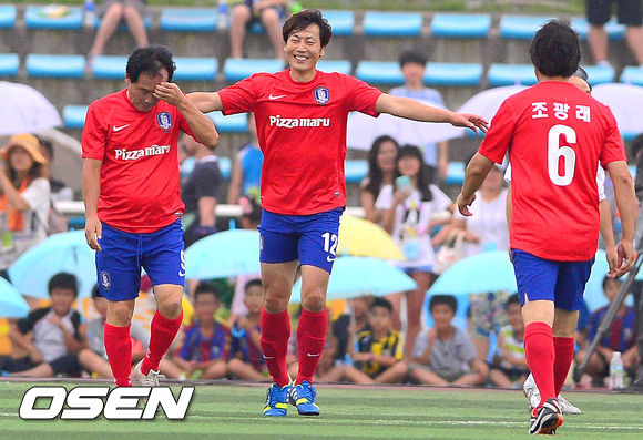 30일 오후 경기도 남양주종합운동장에서 열린 'I-리그' 여름축구축제' 국가대표 올스타팀과 연예인축구단의 친선 경기 전반 유동춘이 선취골을 넣자 어시스트 기록한 송종국이 기뻐하고 있다.