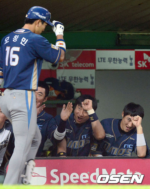 30일 오후 인천 문학구장에서 열린 '2013 한국야쿠르트 세븐 프로야구' SK 와이번스와 NC 다이노스의 경기, 5회초 2사 NC 모창민이 솔로 홈런을 때린 뒤 동료들과 세레모니를 하고 있다.