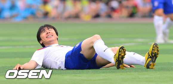 30일 오후 경기도 남양주종합운동장에서 열린 'I-리그' 여름축구축제' 국가대표 올스타팀과 연예인축구단의 친선 경기 후반 공을 놓치며 쓰러지 신태용이 그라운드에 누워 아쉬워하고 있다