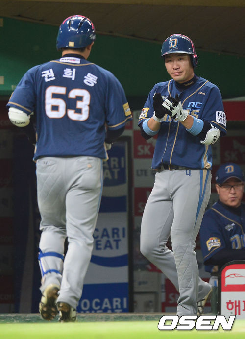 30일 오후 인천 문학구장에서 열린 '2013 한국야쿠르트 세븐 프로야구' SK 와이번스와 NC 다이노스의 경기, 6회초 무사 NC 지석훈이 홈런을 때리고 더그아웃으로 들어오는 권희동을 축하해주고 있다.