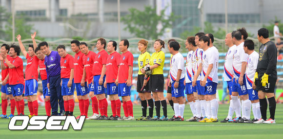 30일 오후 경기도 남양주종합운동장에서 열린 'I-리그' 여름축구축제' 국가대표 올스타팀과 연예인축구단의 친선 경기, 2-2로 무승부를 기록한 양팀 선수들이 팬들에게 인사를 하고 있다.