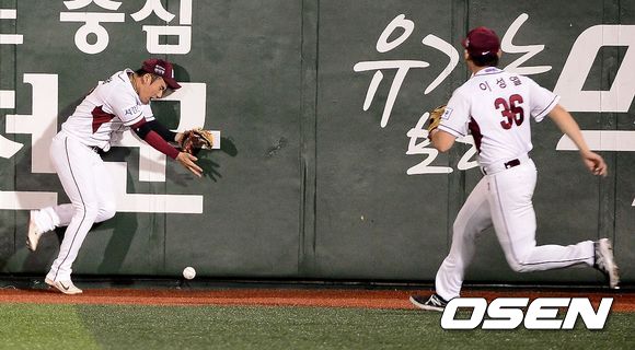 7회초 무사에서 넥센 문우람이 한화 김태완의 타구를 아쉽게 놓치고 있다.