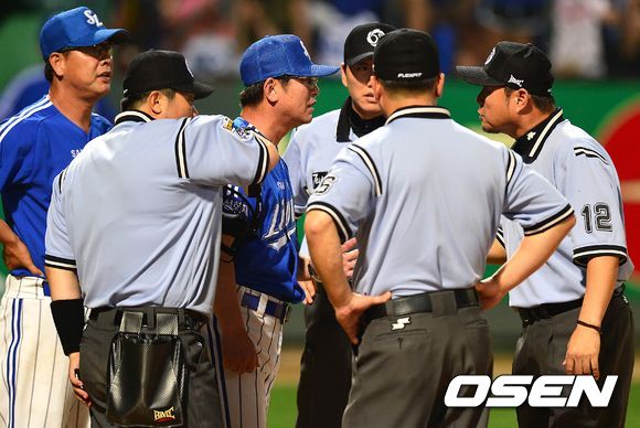 30일 오후 광주 무등경기장에서 '2013 한국야쿠르트 세븐 프로야구' KIA 타이거즈 대 삼성 라이온즈의 경기가 열렸다. 6회초 삼성 공격 1사 1, 2루 상황 채태인의 헛스윙 아웃 판정에 관해 삼성 류중일 감독이 심판진에 항의하고 있다.
