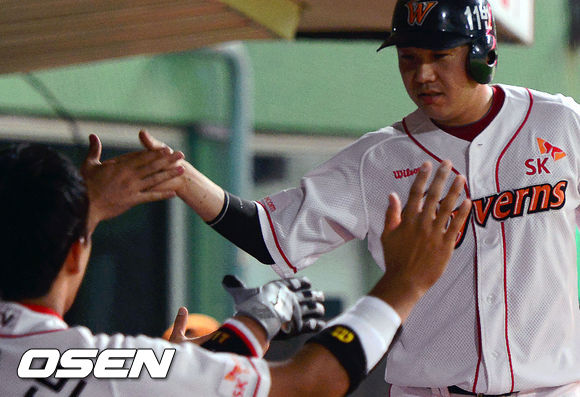 30일 오후 인천 문학구장에서 열린 '2013 한국야쿠르트 세븐 프로야구' SK 와이번스와 NC 다이노스의 경기, 7회말 2사 1,2루 SK 박진만이 조동화의 안타로 득점을 올린 뒤 동료들과 기뻐하고 있다.