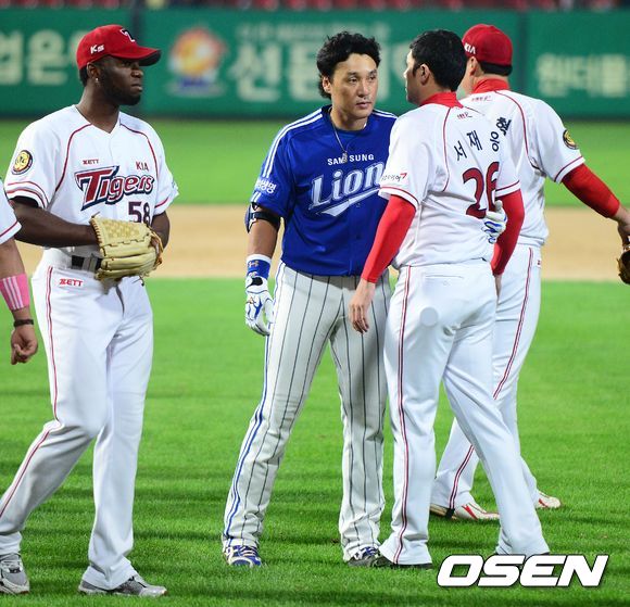 4회초 삼성 공격 2사 2루 상황 2번타자 박한이 타석, KIA 선발 김진우의 몸쪽 공으로 인해 벤치클리어링이 발생했다. KIA 서재응을 말리고 있는 삼성 이승엽.