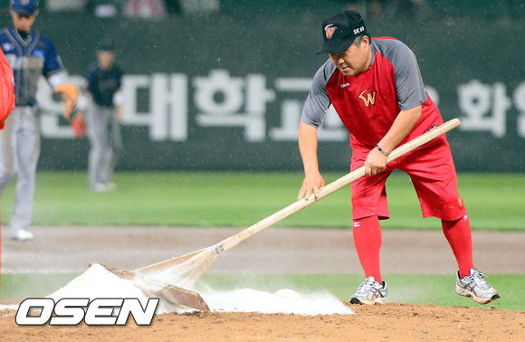 30일 오후 인천 문학구장에서 열린 '2013 한국야쿠르트 세븐 프로야구' SK 와이번스와 NC 다이노스의 경기, 구장 관계자가 폭우로 인해 젖어있는 마운드를 정비하고 있다.