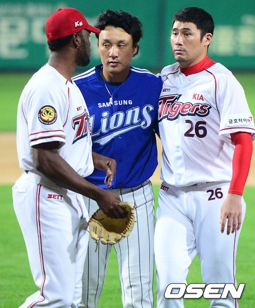 4회초 삼성 공격 2사 2루 상황 2번타자 박한이 타석, KIA 선발 김진우의 몸쪽 공으로 인해 벤치클리어링이 발생했다. 서재응을 말리는 삼성 이승엽과 KIA 소사.