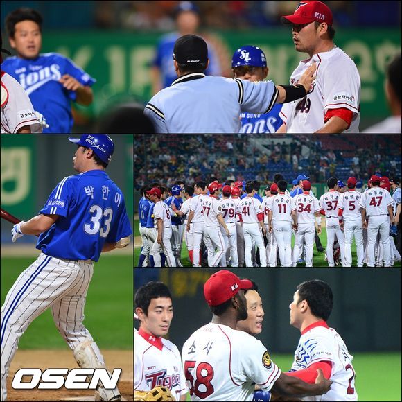 4회초 삼성 공격 2사 2루 상황 2번타자 박한이 타석, KIA 선발 김진우의 몸쪽 공으로 인해 벤치클리어링이 발생했다. 양팀 선수들이 김진우와 박한이의 충돌을 막기 위해 그라운드로 뛰어들고 있는 상황에서 이승엽이 서재응 선수의 흥분을 가라앉히고 있다.