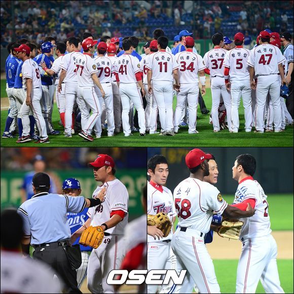 4회초 삼성 공격 2사 2루 상황 2번타자 박한이 타석, KIA 선발 김진우의 몸쪽 공으로 인해 벤치클리어링이 발생했다. 김진우와 박한이의 충돌을 막기 위해 그라운드로 뛰어들고 있는 상황에서 이승엽이 서재응 선수의 흥분을 가라앉히고 있다.