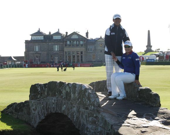 [OSEN=스포츠부] 박인비(25, KB금융그룹)가 브리티시 오픈이 열리는 세인트 앤드루스 골프장 18번홀 스윌큰브릿지에서 약혼자와 포즈를 취하고 있다.